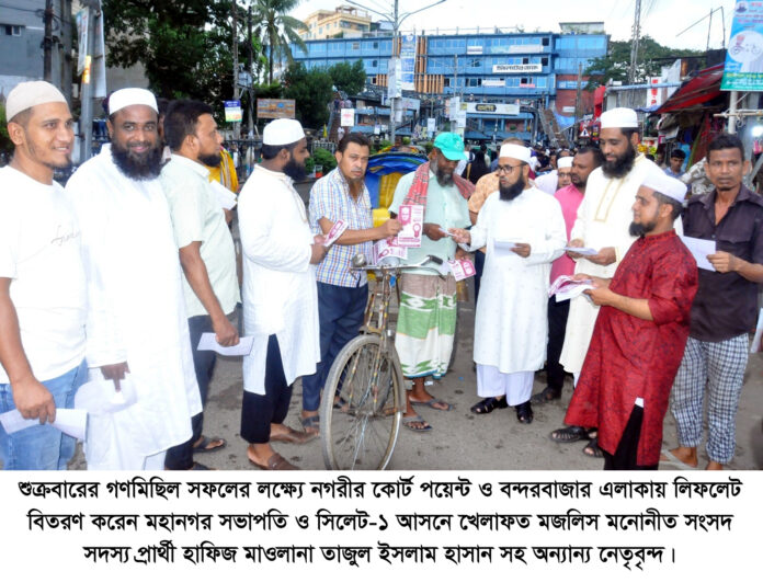 জুলাই সনদের আইনি ভিত্তি প্রদান ও বাস্তবায়ন সহ ৬দফা দাবিতে কেন্দ্র ঘোষিত কর্মসূচির অংশ হিসেবে আগামীকাল ১০ অক্টোবর শুক্রবার বাদ জুমা বন্দরবাজার কেন্দ্রীয় জামে মসজিদ গেইট থেকে খেলাফত মজলিস সিলেট মহানগর শাখার উদ্যোগে নগরীতে গণমিছিল বের করা হবে। আগামীকালের গণমিছিল কর্মসূচি সফলের লক্ষ্যে আজ বৃহস্পতিবার বিকেলে নগরীর কোর্ট পয়েন্ট, সিটি পয়েন্ট ও বন্দরবাজার সহ বিভিন্ন স্থানে মহানগর শাখার নেতৃবৃন্দ লিফলেট বিতরণ করেন। পরে সিলেট সিটি পয়েন্টে এক পথ সভা অনুষ্ঠিত হয়। মহানগর শাখার সভাপতি ও সিলেট-১ আসনে খেলাফত মজলিস মনোনীত সংসদ সদস্য প্রার্থী হাফিজ মাওলানা তাজুল ইসলাম হাসানের সভাপতিত্বে অনুষ্ঠিত পথ সভায় বক্তব্য রাখেন খেলাফত মজলিসের সিলেট জেলা শাখার সাধারণ সম্পাদক ও সিলেট-৩ আসনের সংসদ সদস্য প্রার্থী মাওলানা দিলওয়ার হোসাইন। লিফলেট বিতরণ কর্মসূচিতে অন্যান্য নেতৃবৃন্দের মধ্যে উপস্থিত ছিলেন মহানগর সহ-সভাপতি মাওলানা শাহ আশিকুর রহমান, মাওলানা ইমদাদুল হক নোমানী, সাধারন সম্পাদক হাফিজ মাওলানা জাবেদুল ইসলাম চৌধুরী, সহসাধারণ সম্পাদক মাওলানা জুনায়েদ আহমদ, মাসুদ আহমদ, সাংগঠনিক সম্পাদক অধ্যক্ষ মাওলানা মনজুরে মাওলা, সমাজকল্যাণ সম্পাদক ইঞ্জিনিয়ার শাহজাহান কবির ডালিম, শ্রমিক মজলিস সিলেট মহানগর সভাপতি মাওলানা আব্দুর রহিম, জেলা সহসভাপতি আবুল কাশেম, ইসলামী যুব মজলিস সিলেট জেলা সেক্রেটারি মাওলানা সাদিকুর রহমান প্রমূখ।