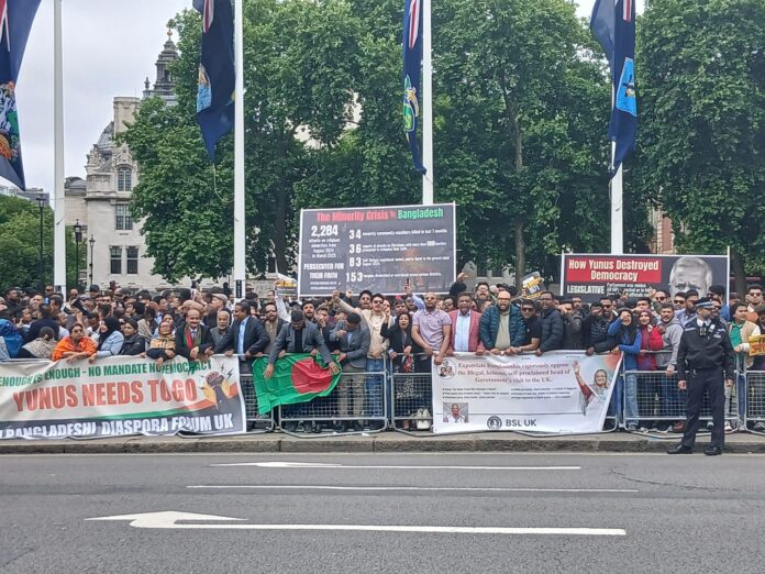 অন্যদিকে, একই হোটেলের সামনে অবস্থান নিয়ে প্রধান উপদেষ্টার বিরুদ্ধে বিক্ষোভ করেছেন যুক্তরাজ্যে অবস্থানরত আওয়ামী লীগের নেতা–কর্মী ও সমর্থকেরা। প্রধান উপদেষ্টার লন্ডনে অবস্থানের পুরোটা সময় বিক্ষোভ ও প্রতিবাদ চালিয়ে যাওয়ার ঘোষণা দেন তারা। এই বিক্ষোভে ছিলেন সুনামগঞ্জ-১ আসনের সাবেক এমপি রণজিত সরকার, হবিগঞ্জ-৩ আসনের সাবেক এমপি ও সিলেট মহানগর আওয়ামী লীগের যুগ্ম সাধারণ সম্পাদক বিধান কুমার সাহা। এদের যুক্তরাজ্যে প্রথমবারের মতো প্রকাশ্যে দেখা গেছে। এছাড়াও সাবেক প্রতিমন্ত্রী খালিদ মাহমুদ চৌধুরীসহ বেশ কয়েকজন সাবেক মন্ত্রী, এমপি, আ স ম মিসবাহ উদ্দিন সিরাজ, যক্তরাজ্য আওয়ামীলীগের সেক্রেটারি সাজিদূর রহমান, সাংগঠনিক সম্পাদক আব্দুল আহাদ চৌধুরী, ছাত্রলীগ নেতা তামিম আহমদ, স্বরন, সৈয়দ করিম রায়হান,মুস্তাফিজুর রহমান সোহাগ রাফি বিন কামাল, শরিফ আলম সহ যুক্তরাজ্য আওয়ামীলীগ ছাত্রলীগের নেতাকর্মীরা বিক্ষোভে অংশ নেন।