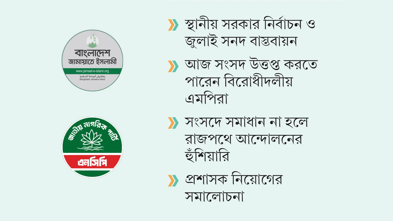 স্থানীয় সরকার নির্বাচন ও জুলাই জাতীয় সনদ বাস্তবায়ন ইস্যুতে সোচ্চার হচ্ছে জামায়াতে ইসলামী নেতৃত্বাধীন বিরোধীদলীয় জোট। এ দুই বিষয় নিয়ে বিরোধীদলীয় সংসদ সদস্যরা আজ সংসদ উত্তপ্ত করতে পারেন বলে আভাস পাওয়া গেছে। অধিবেশনের আগে বেলা ১১টায় বৈঠক করবেন বিরোধীদলীয় এমপিরা।