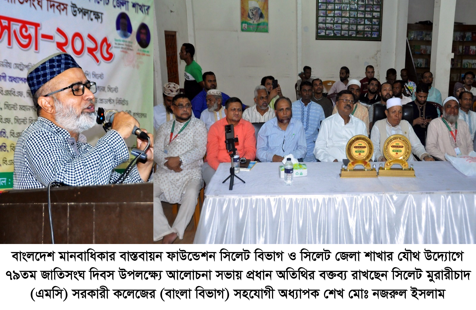 শুক্রবার (২৪ অক্টোবর) বিকেল ৪টায় নগরীর জিন্দাবাজারস্থ নজরুল একাডেমি হলরুমে বাংলদেশ মানবাধিকার বাস্তবায়ন ফাউন্ডেশন সিলেট বিভাগ ও সিলেট জেলা শাখার যৌথ উদ্যোগে ৭৯তম জাতিসংঘ দিবস উপলক্ষ্যে আলোচনা সভায় প্রধান অতিথির বক্তব্যে তিনি উপরোক্ত কথাগুলো বলেন।
