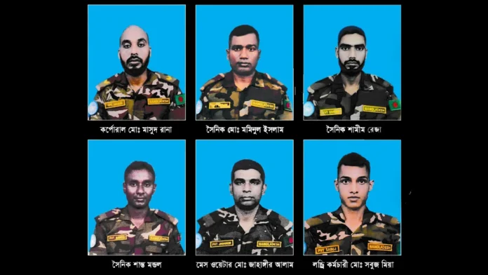 সুদানের আবেই এলাকায় জাতিসংঘ শান্তিরক্ষীদের ওপর বিচ্ছিন্নতাবাদী সশস্ত্র গোষ্ঠীর হামলায় নিহত বাংলাদেশ সেনাবাহিনীর ছয় সদস্যের পরিচয় পাওয়া গেছে। এক সংবাদ বিজ্ঞপ্তির মাধ্যমে আন্তঃবাহিনী জনসংযোগ পরিদপ্তর (আইএসপিআর) নিহত ও আহত ৮ সেনা সদস্যদের পরিচয় ও ছবি প্রকাশ করেছে।
